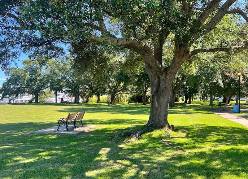 Grassy lawns, oak trees, and water views. Plus paved paths & benches.
